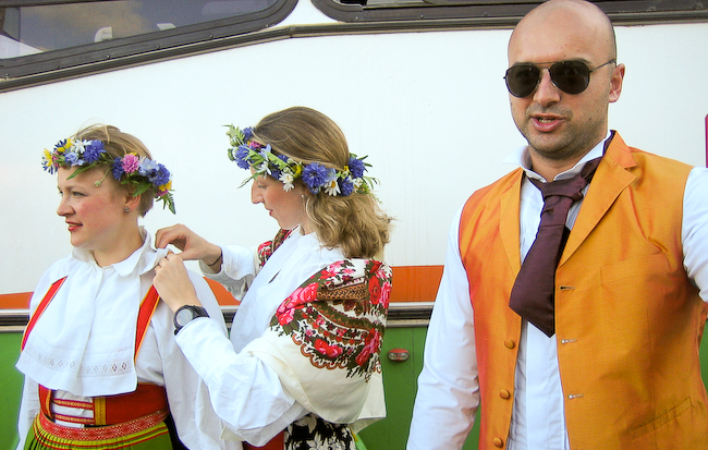 Kassem, Lina och Karolina forbereder sig infor avfard mot Vodafone arena. Svenska folkdrakter ar populara i sodra Stilla havet. Stundtals tanker jag pa de folk som skickades fran den har regionen for 100 ar sedan for att visas upp infor europeer. Payback time.
